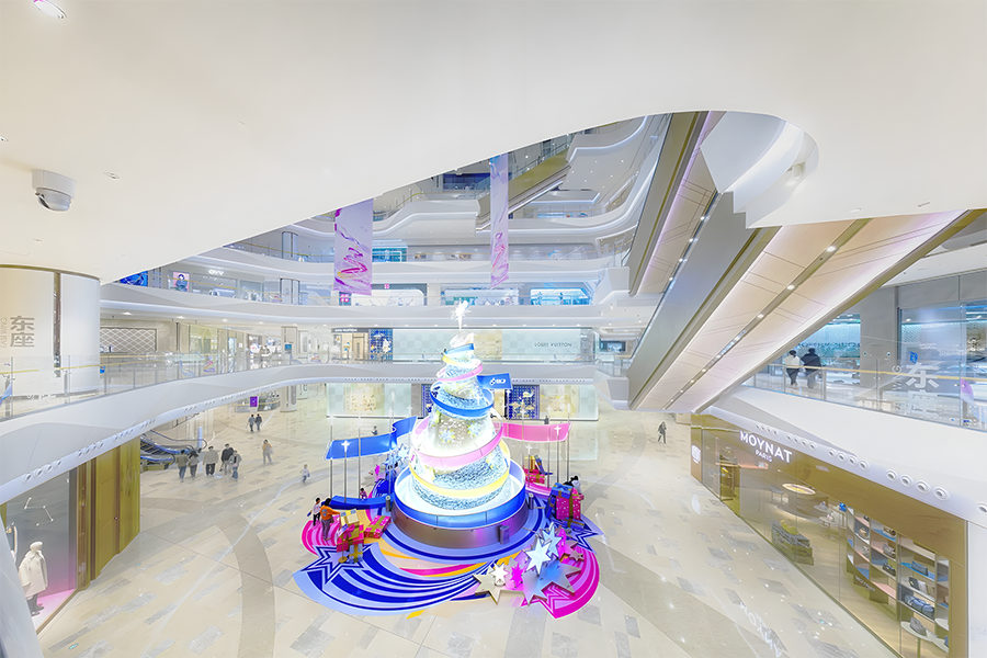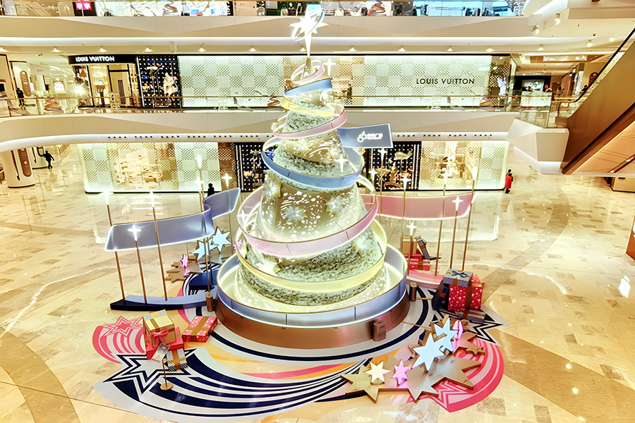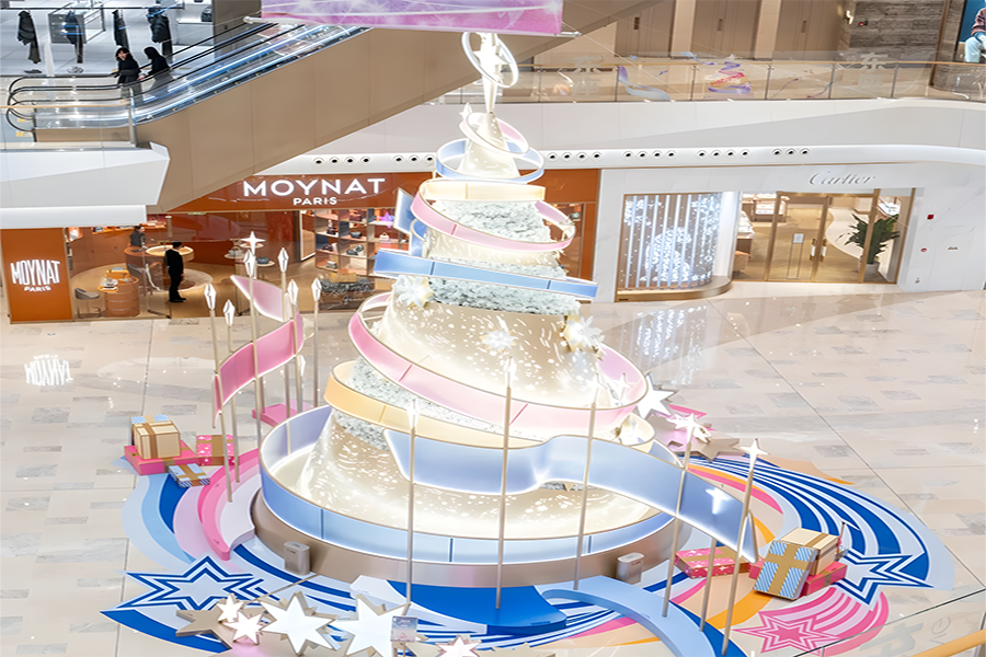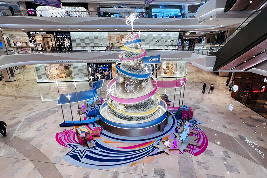 2024年,武漢恒隆廣場(chǎng)的圣誕樹(shù)裝置再次升級(jí),由發(fā)光彩帶、雪花和星星環(huán)繞而成,整個(gè)裝置絢麗而夢(mèng)幻,仿佛置身于童話世界之中。